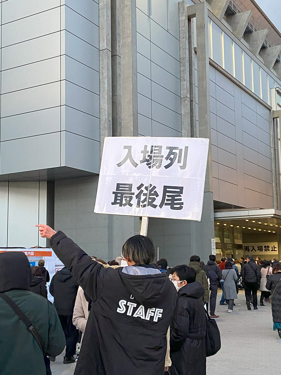列が進むと目に入ってくるのは、入口の手前にグッズチラシの大看板がありそれを見て吟味する方、購入直前の窓口で悩む方、色々とおられた。相変わらず、グッズ販売は好調のようだ。