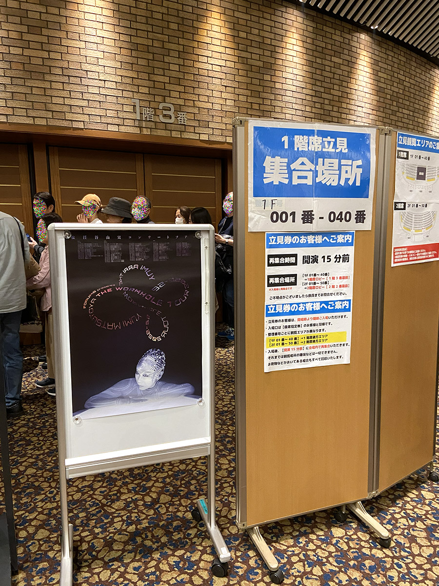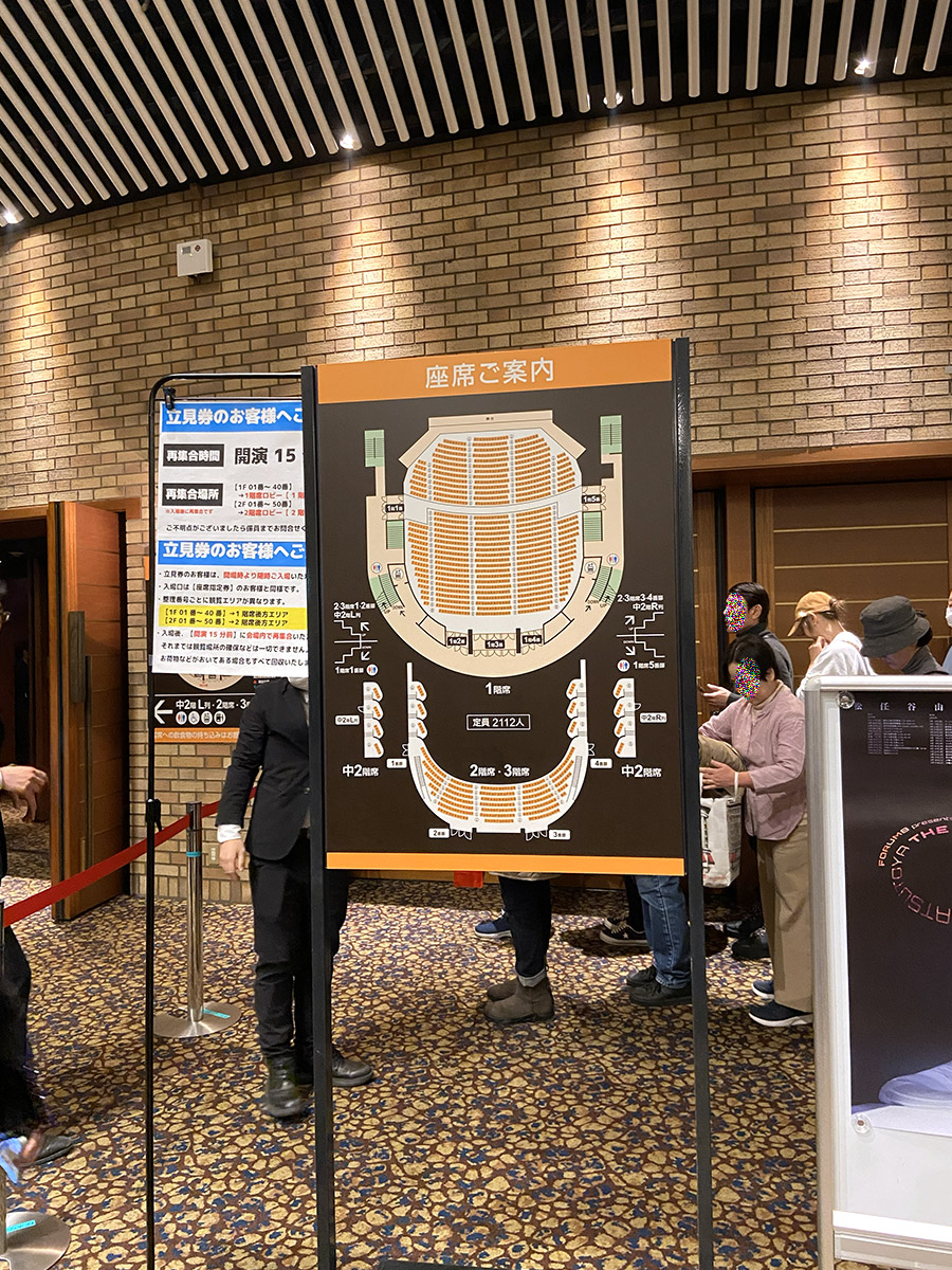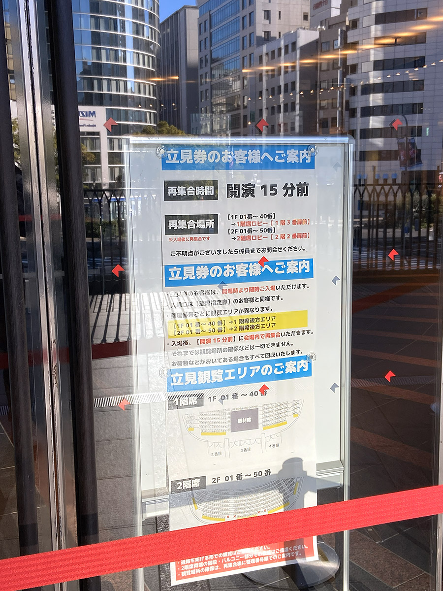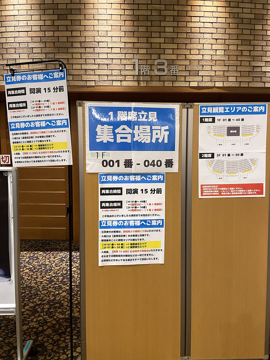 エスカレーターで上がっていくと、正面の看板に当日券無しとの赤い貼り紙を発見。右手は長蛇の列で今まさに入場中であったが、並んで入ることになった。大阪公演と同じように入口手前で顔写真付き証明証の確認、次のところで同じく確認と電子チケットにスタンプを押印された。