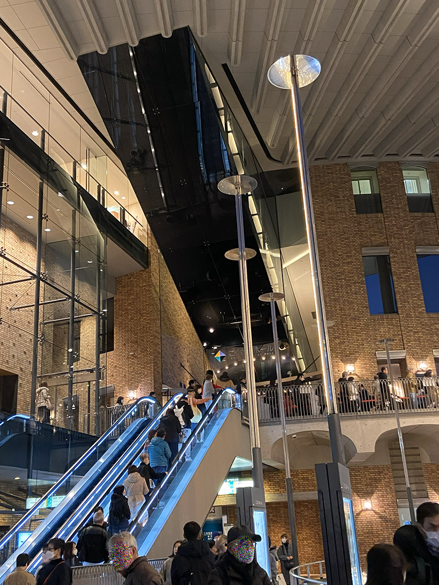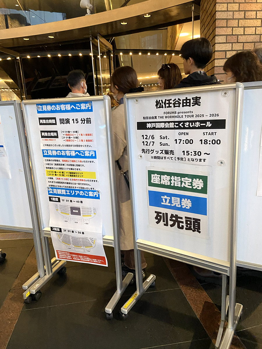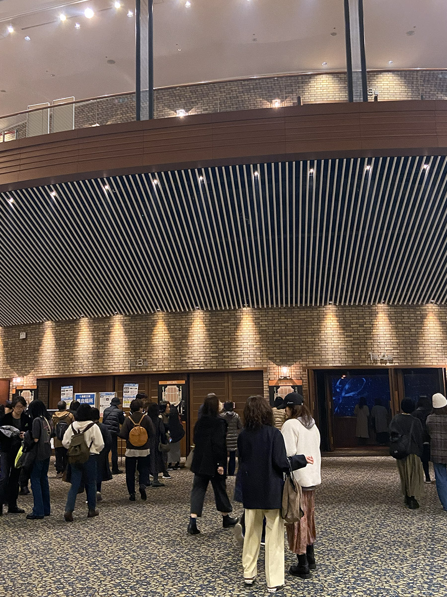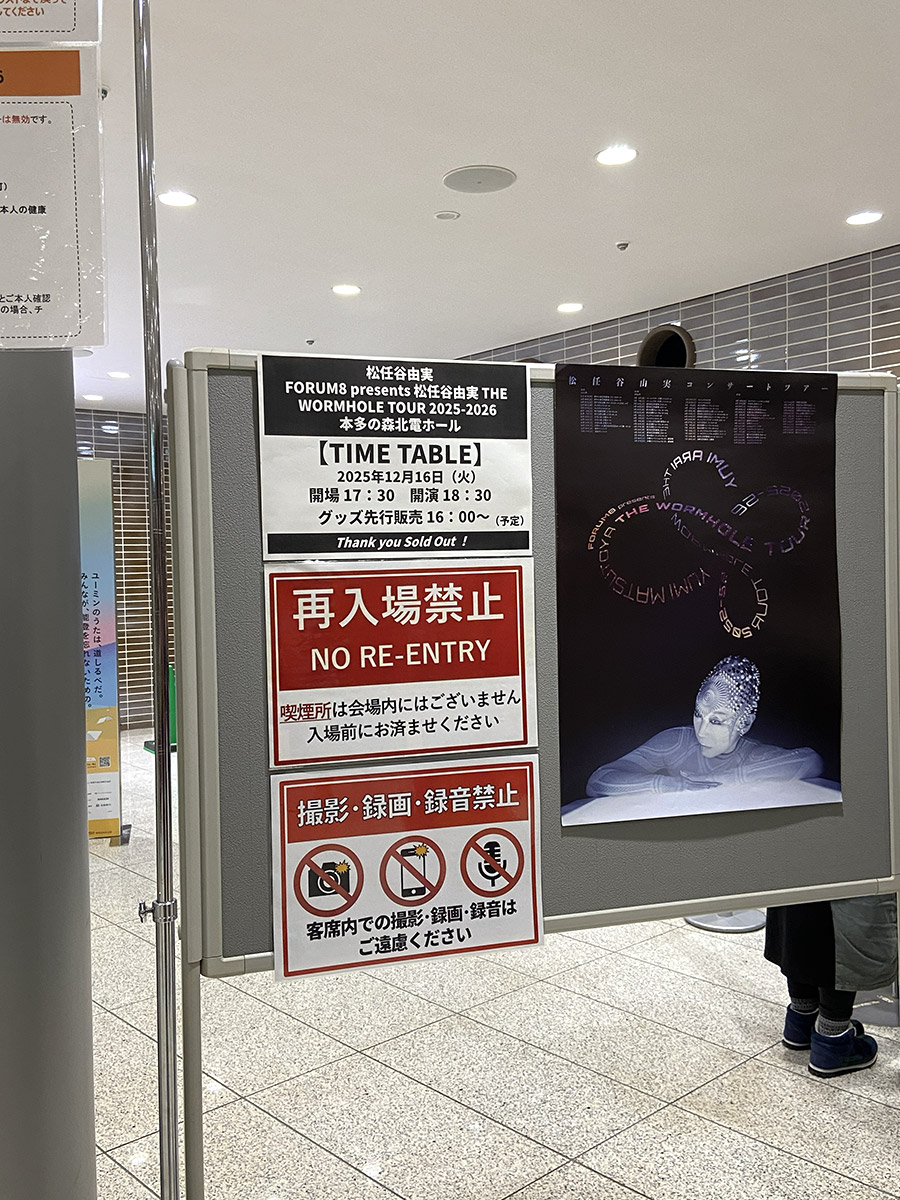 エスカレーターで上がっていくと、正面の看板に当日券無しとの赤い貼り紙を発見。右手は長蛇の列で今まさに入場中であったが、並んで入ることになった。大阪公演と同じように入口手前で顔写真付き証明証の確認、次のところで同じく確認と電子チケットにスタンプを押印された。