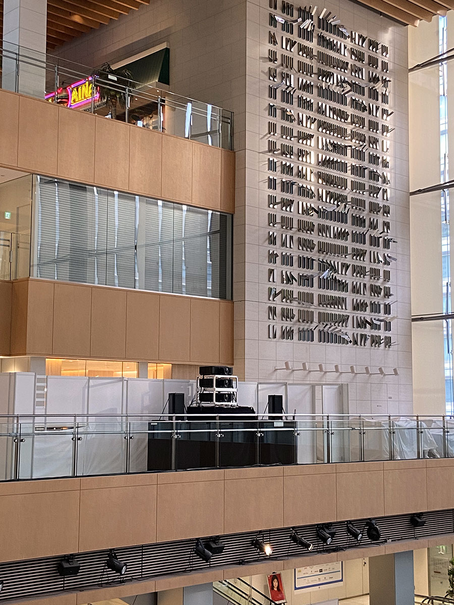 3階回廊のプロジェクションマッピングショーPA席周りは、白い布で覆いかぶさっていて警備員がついていた。