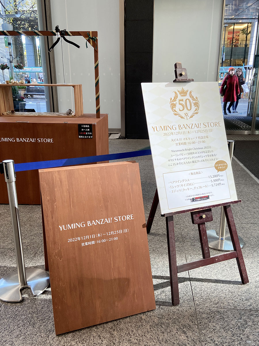 オリジナルのペアワイングラスやTシャツなどが、丸ビル1階マルキューブ特設売場「YUMING BANZAI!STORE」で、期間中毎日16時から販売 される。