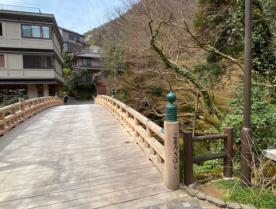 総ひのき作りの橋は、風情たっぷりで女性っぽい感じがします。逆に川の流れが早く、聴こえてくるせせらぎの音は荒々しい感じがしました。山中温泉の景勝地ですので、見学者が結構おられました。また川べりに行ける階段があり降りて行けたので、橋の下から撮れる景色も綺麗です。