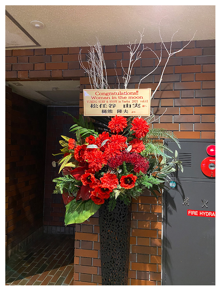 4号館に入館するとすぐのところには、サーモグラフティが設置されていた。ロビーには、祝花スタンドが4台ほどあるだけだった。また昨年みたいに、フロントにユーミン関連の販促物が飾れてはいなかった。全ては密を作らない感染予防対策のためなんだろう。