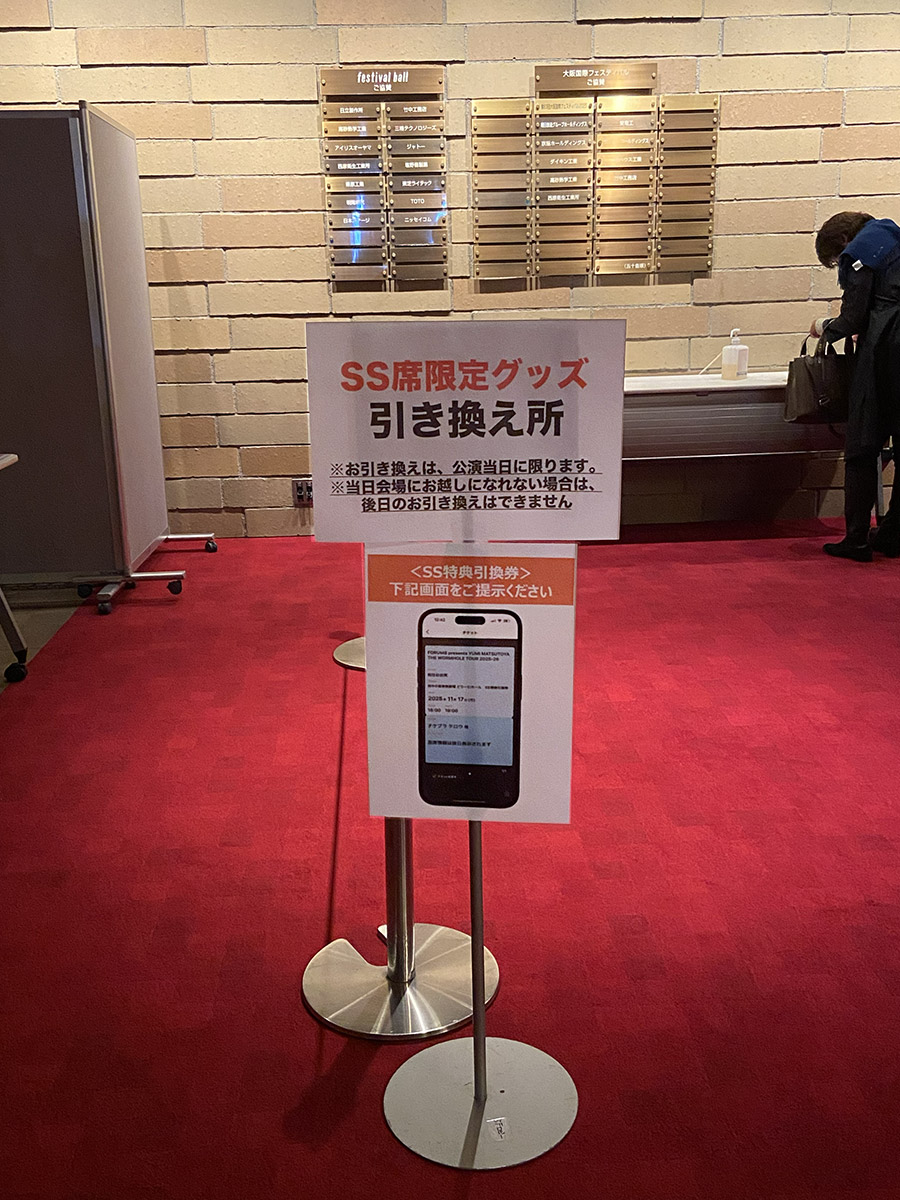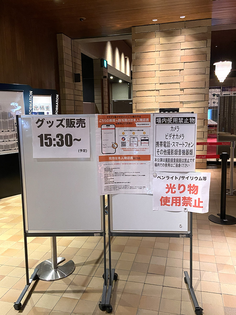 15時56分に女性スタッフからグッズがオープンするとのことで、販売がスタートした。並んでいる人数は数えていないが、100名以上は並んでいたのではないだろうか。会場内での販売ではなく、会場内の右側のロビー入口側に販売ブースを設けて、4箇所での販売、4名のスタッフでの対応であった。やっと購入できたことに安堵した。