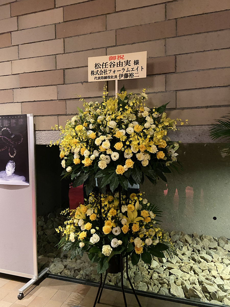ロビーは人でいっぱい、正面に23基のお祝い花スタンドが設置、右側の入口側にCD販売ブース、左側の入口側にグッズ販売ブースが設けられ、グッズ販売には長蛇の列がなされていた。