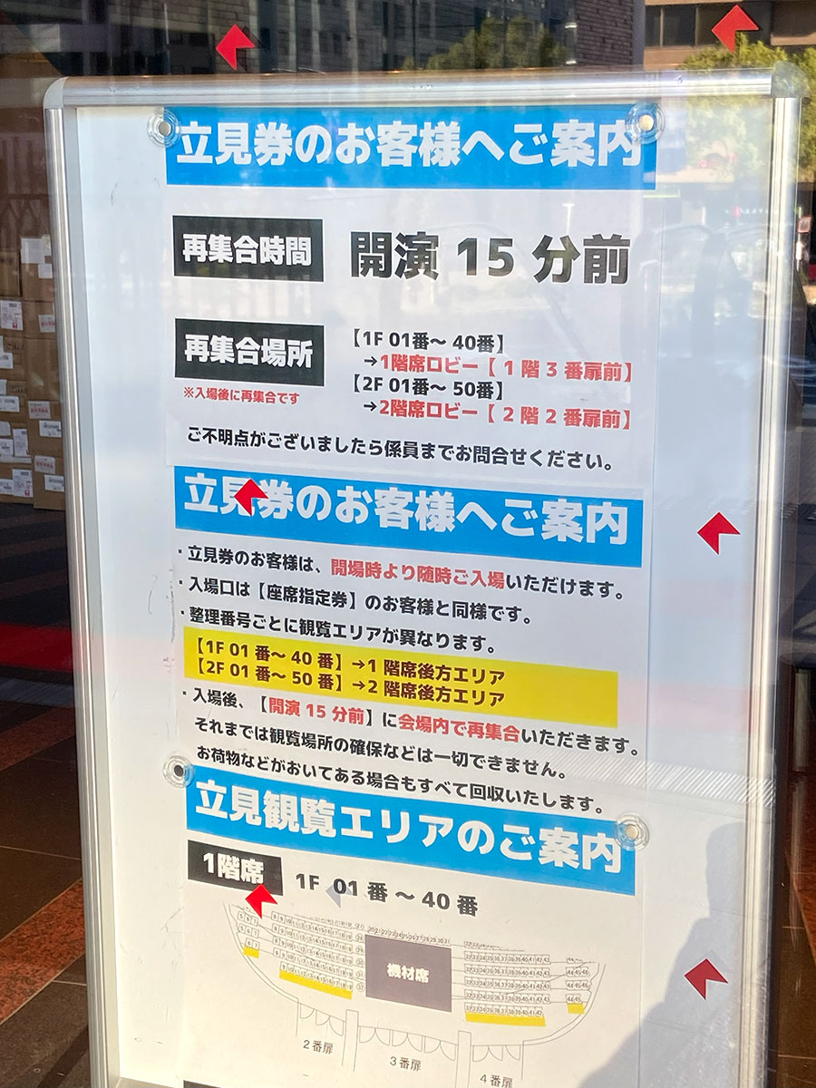 エスカレーターで上がっていくと、正面の看板に当日券無しとの赤い貼り紙を発見。右手は長蛇の列で今まさに入場中であったが、並んで入ることになった。大阪公演と同じように入口手前で顔写真付き証明証の確認、次のところで同じく確認と電子チケットにスタンプを押印された。