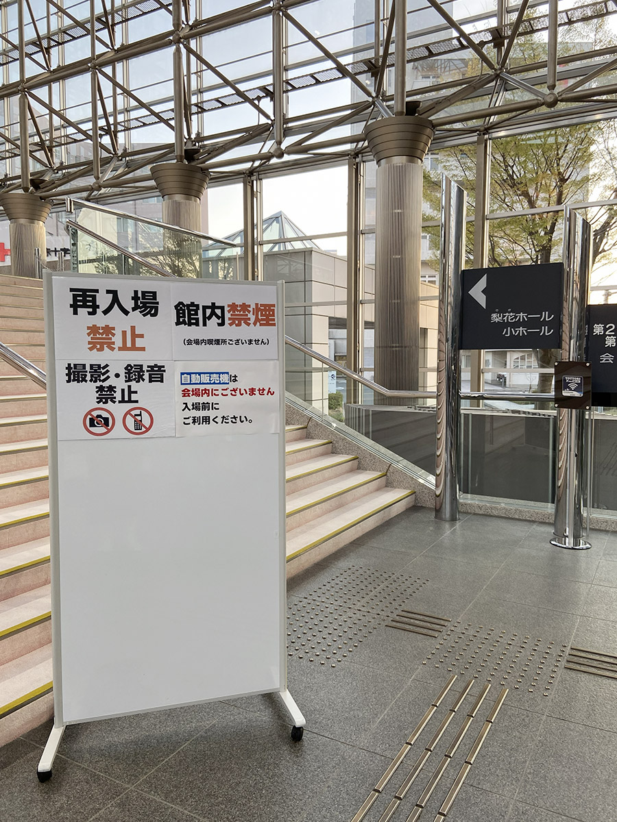 17時50分、スタッフが「撮影禁止・録音禁止」の看板を持ち客席内を移動