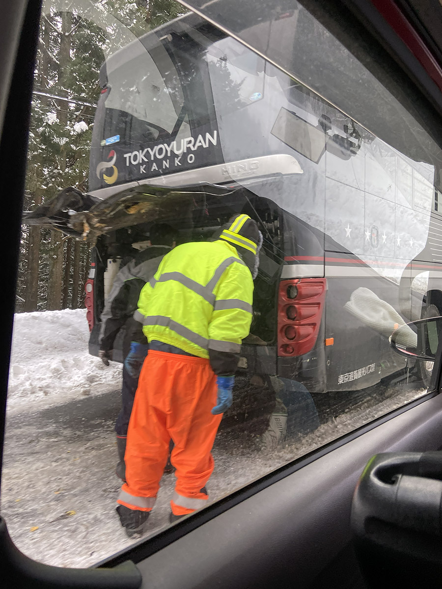 ここから友人の車で移動。今朝のネット情報や友人からの連絡では、関越道の一部区間と三国峠の通行止があったが、今は解除されたとのこと。しかし別の友人からの連絡で、三国峠でバス追突事故が発生して片側車線での走行になっているので注意しなさいとのこと。事故現場付近を通過したとき、車中からカメラに収めた。えげつなくエンジンルームがダメになったバス、乗客は大丈夫だったのか?