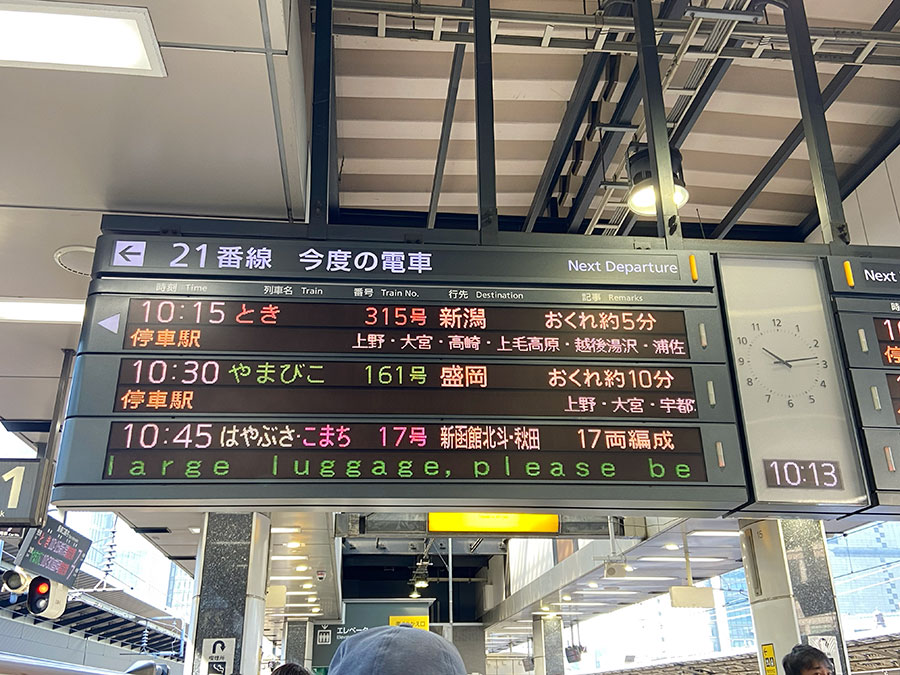 9時45分、上越新幹線がこの段階で10分遅れとの電光掲示板に表示された。そして新幹線の車内は、指定の通路に立つ人、入口付近は座りこむ人でいっぱい。上毛高原駅には、20分遅れの11時40分に到着。